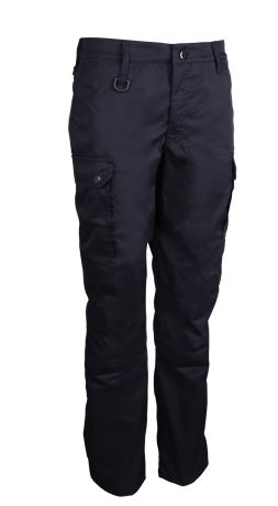 Linning med knapp, 8 beltestropper, D-ring, glidelås i gylf. Bærestykke bak, 2 stikklommer foran, 1 baklomme med glidelås under klaff. 2 passepoilerte lårlommer med glidelås, 2 lårlommer med ekspansjon og klaff, på utsiden av høyre lårlomme, 1 liten pennelomme. Kneputelommer, og stramming av ben med elastikk og tamp.