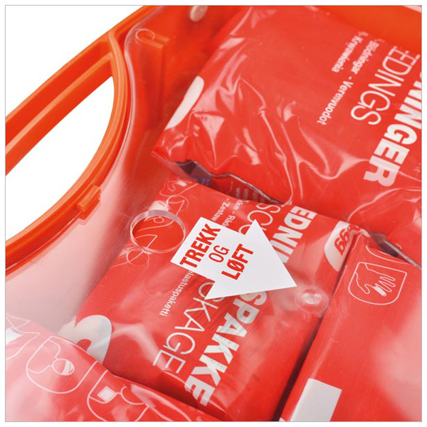 De nummererte innholdsposene inneholder utstyr for ulike bruksområder : Plaster, brudd og klemskader, sår og kutt, hygiene, øyeskylle, blødninger, brannskade,