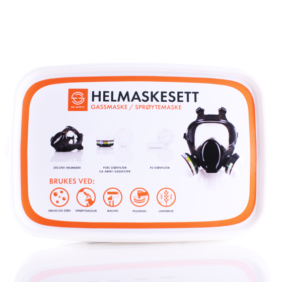 Maskesettet inneholder helmaske, gassfilter og støvfilter, samt rengjøringsserviett. Settet kommer ferdig pakket i en praktisk og lufttett oppbevaringsboks for hygienisk og enkel oppbevaring. Filtrene monteres enkelt på masken. Støvfilter kan klikkes på gassfilteret for kombinert beskyttelse.