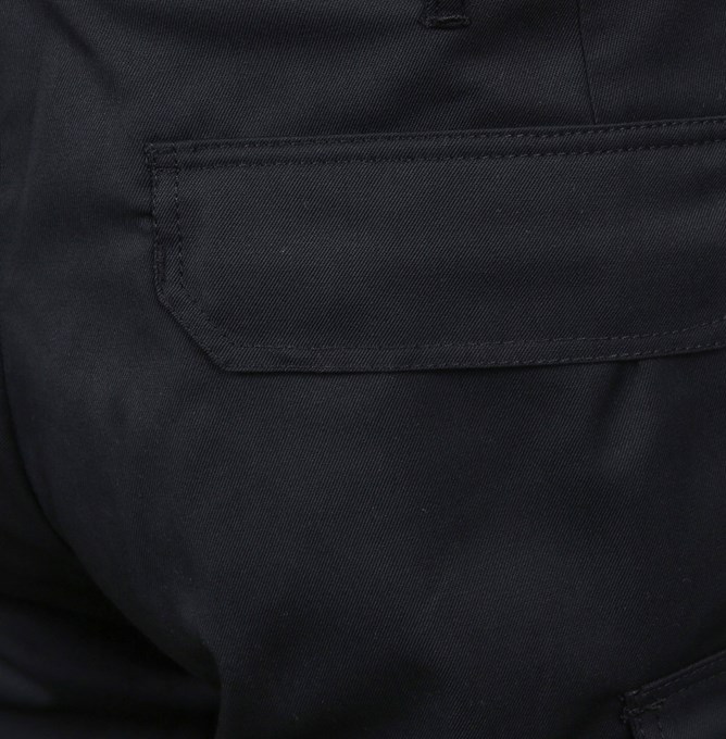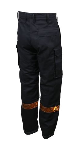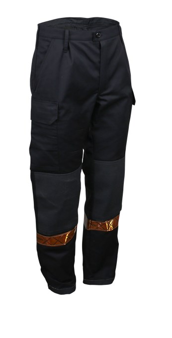 Stikklommer i siden, paspoliert baklomme på høyre side og lårlommer med ekspansjonsfold og klaff. Innvendig lårlomme med mobillomme. Knelommer i Aramid med åpning nederst. Aramidforsterkning og to striper feierrefleks nederst på bena. Linning og beltestropper.